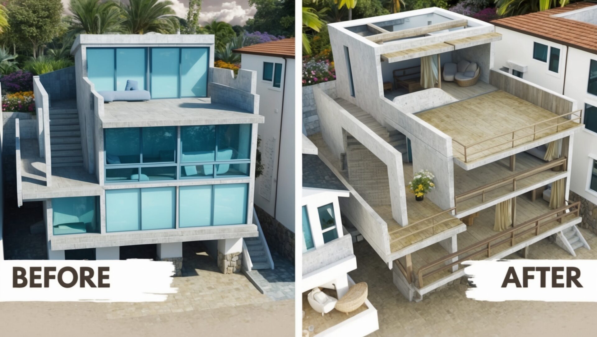 By December 2023, the house – or what was left of it – was back on the market for $53 million. But let’s be real, who wants to buy a concrete shell with no windows, bathrooms, or electricity? Especially one that’s been exposed to the salty sea air, leaving the exterior stairs looking like they’ve been through a war.